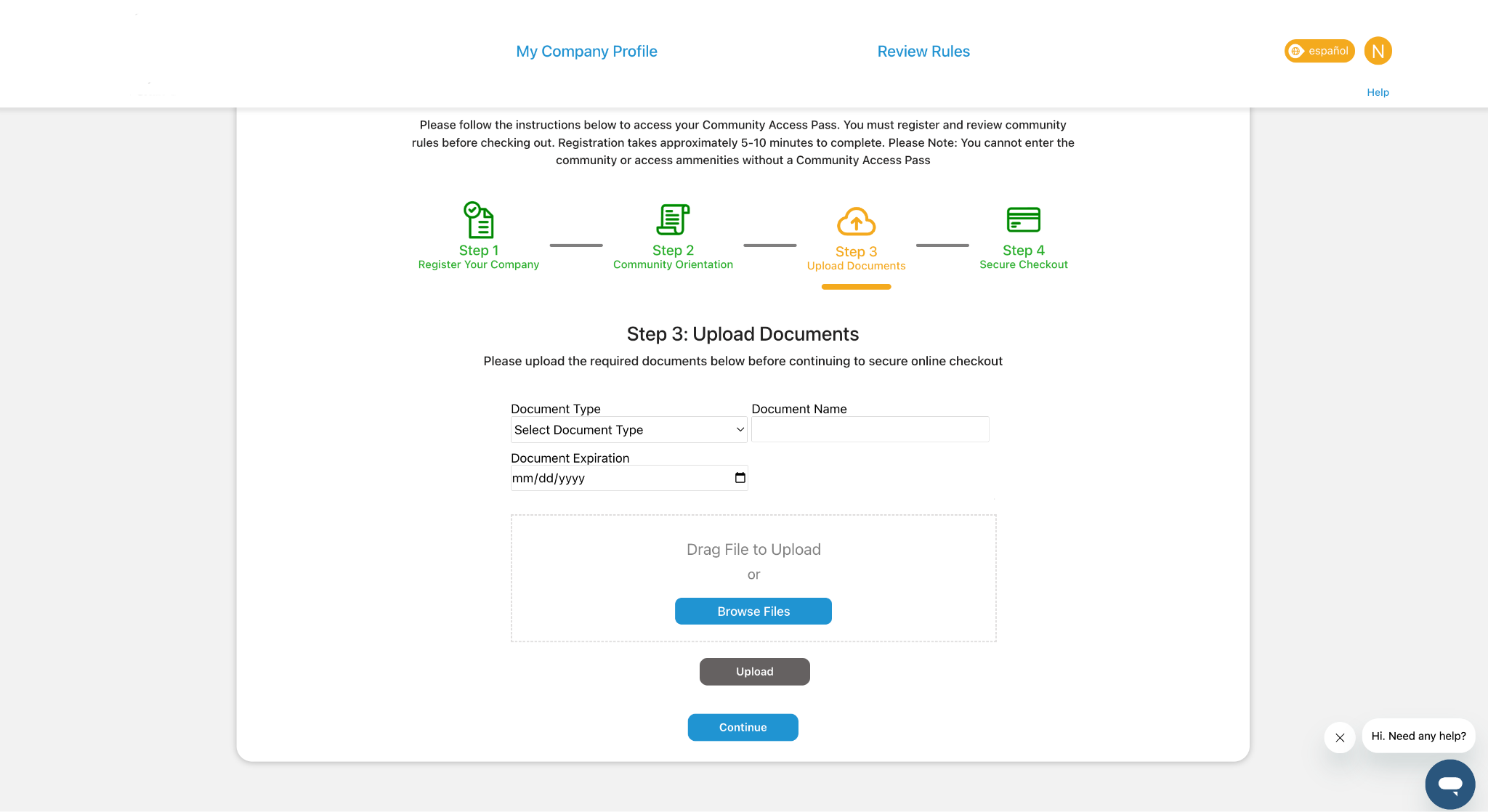 - Confirm: Once all required documents are attached, click Continue.